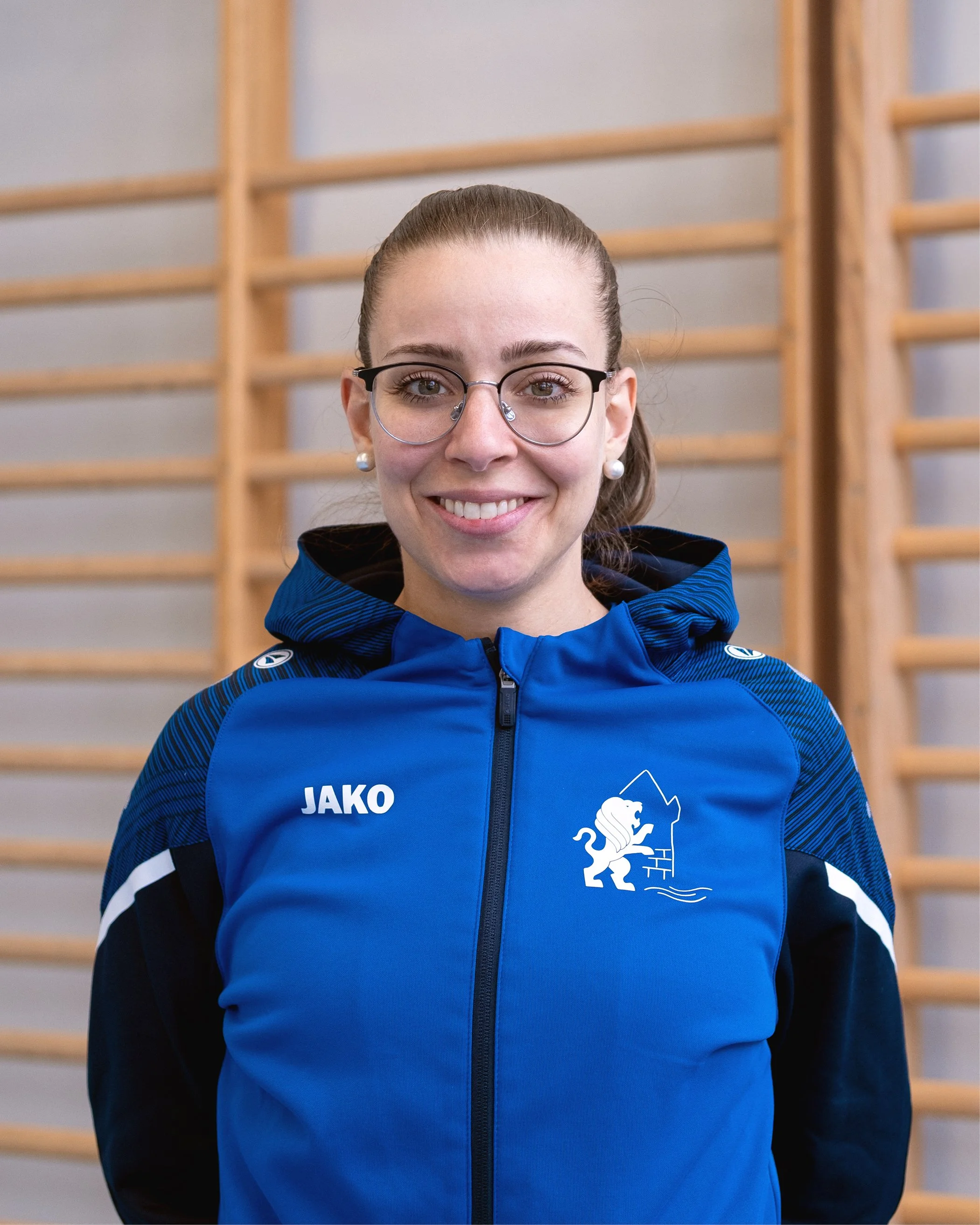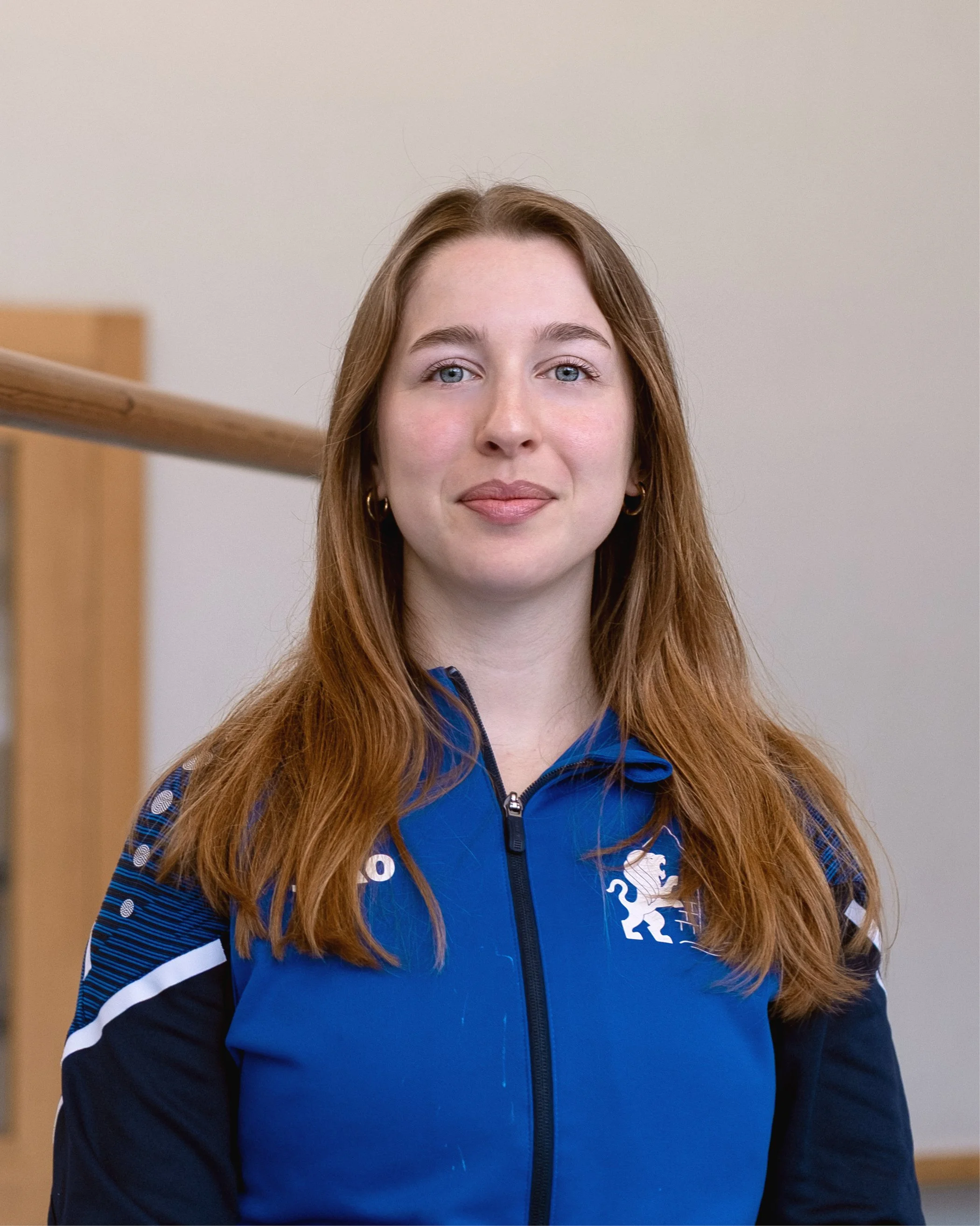 • Junge Frau in blauer Sportsjacke mit Vereinslogo, lächelnd, langes blondes Haar, in der Sporthalle mit Holzstange im Hintergrund.